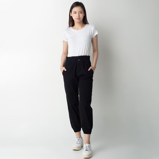 Benhill Celana " Eunji" Bahan Wanita High Waist Jogger Pant Pinggang Karet Black 219-39275