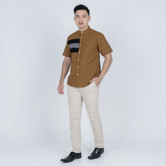 Benhill Kemeja Koko Pria Linen Combination Pendek Coklat tua 50384-51166-165
