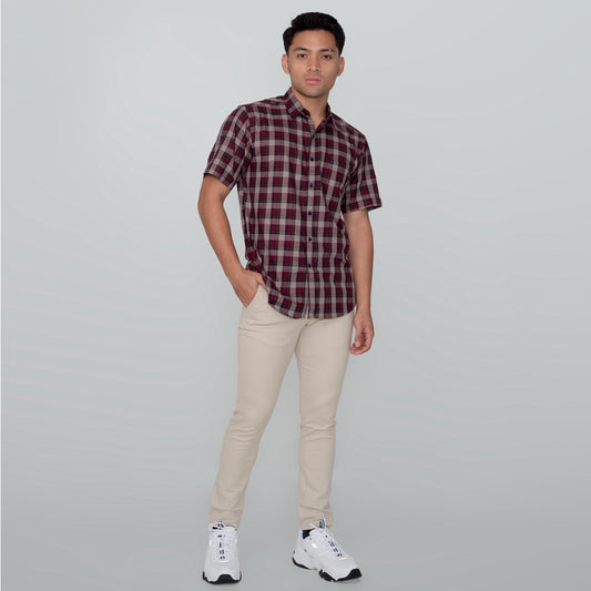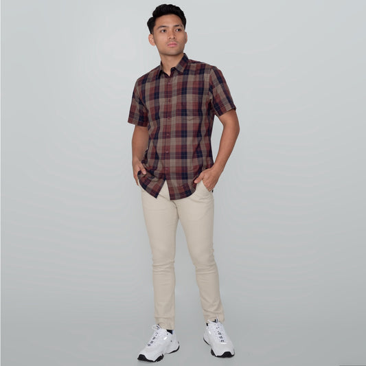Benhill Kemeja Pria Herringbone Lengan Pendek Kotak Maroon 29455-41434