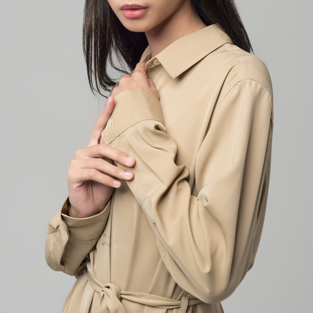 Motif polos dengan warna soft yang sedang menjadi trend saat ini. Dress wanita ini memiliki model midi dengan kancing depan full buka(frendly) bisa digunakan untuk luaran ,saku aktif kanan dan kiri,tali pinggang pisah.