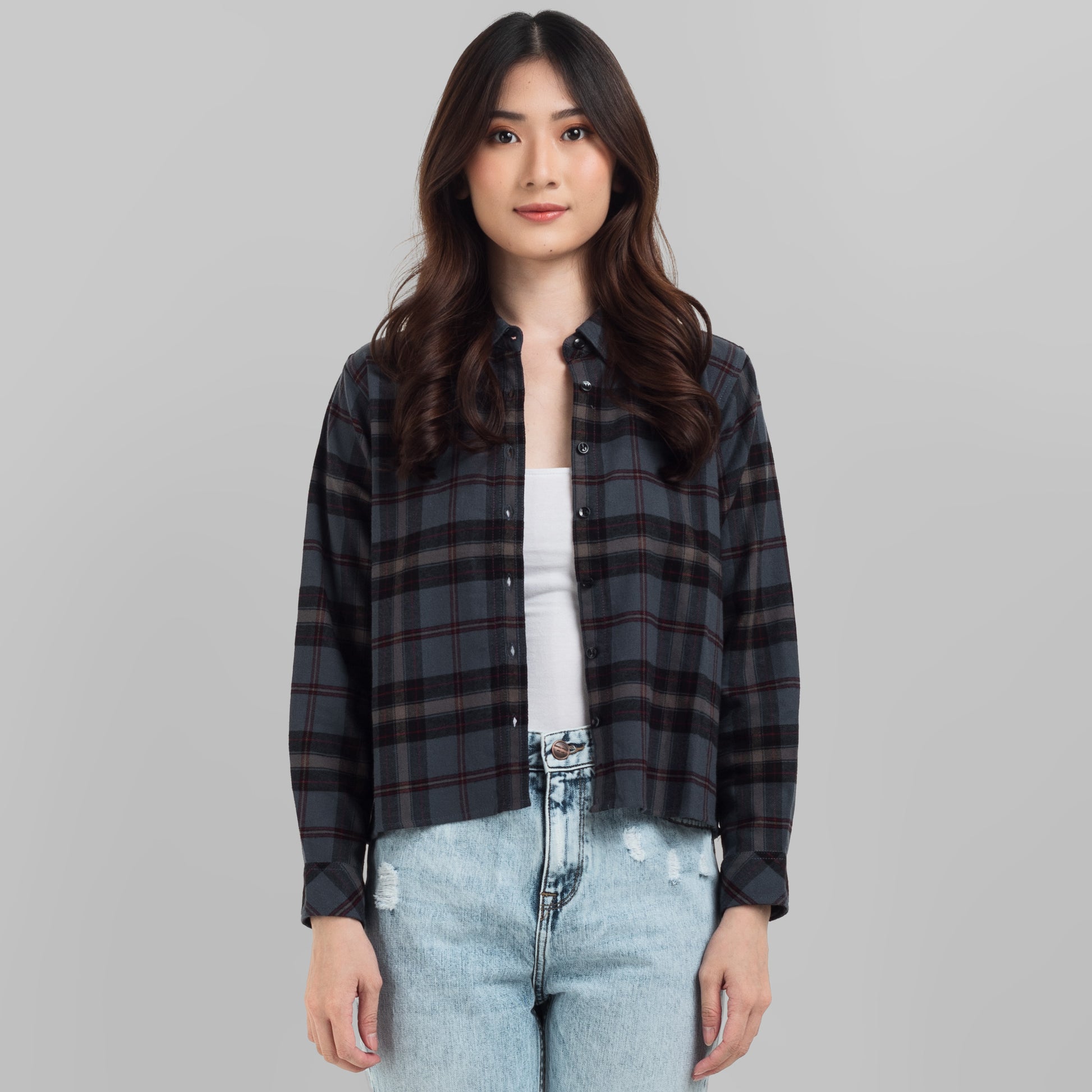 Benhill Kemeja Crop Top Wanita Flannel Lengan Panjang Kotak Abu 771-11684