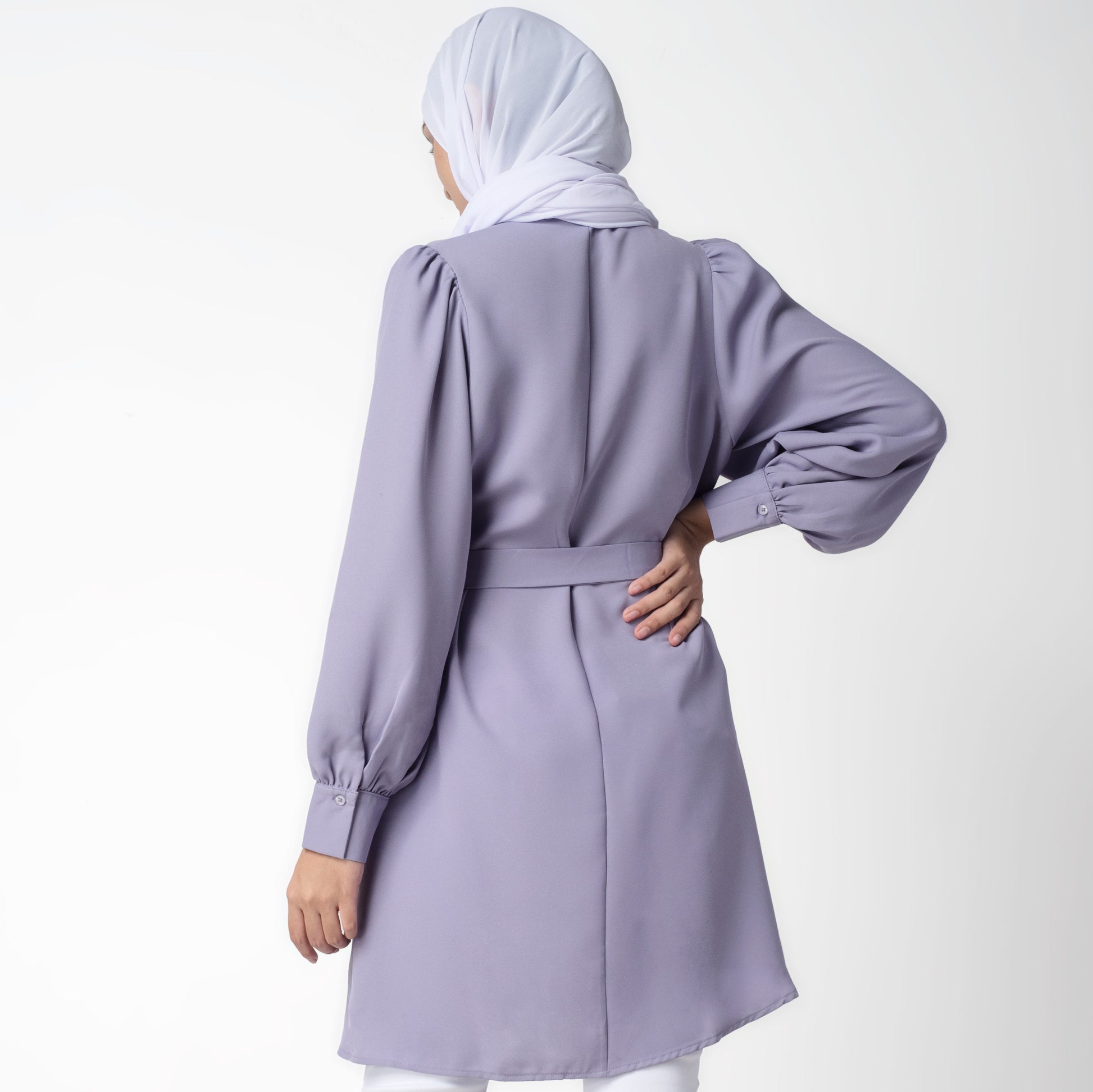 Tunik ini mempunyai model bawah lebar, lengan balon dan ada ikat pinggangnya