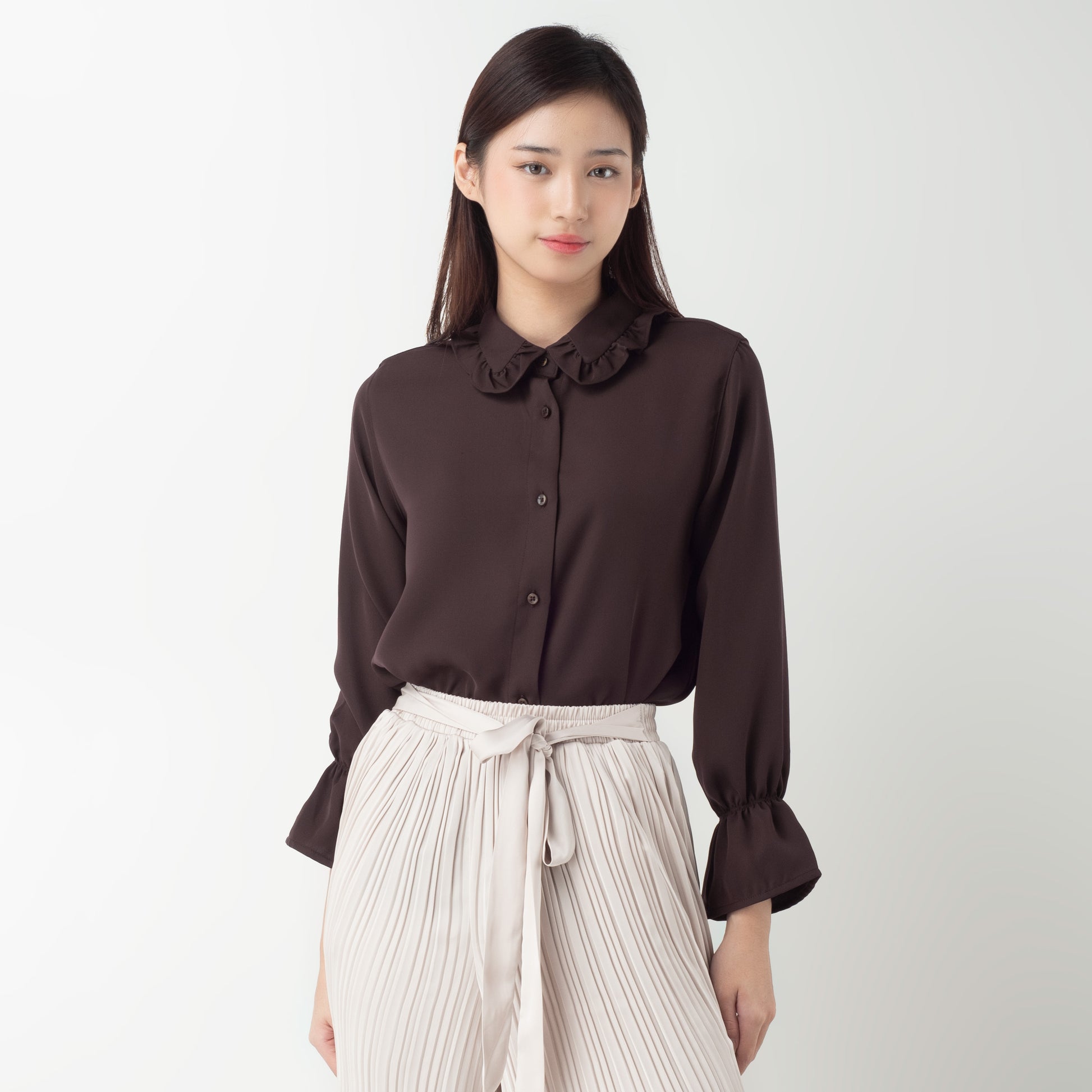 Kemeja ini mempunyai krah peterpan collar, lengan model ruffle dan kancing Full Aktif.