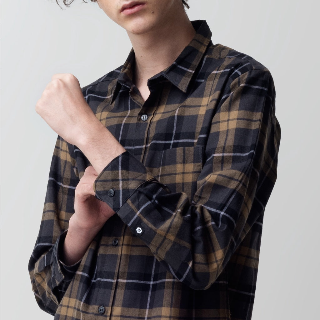 Kemeja pria lengan panjang dengan motif kotak dari bahan Flanel.