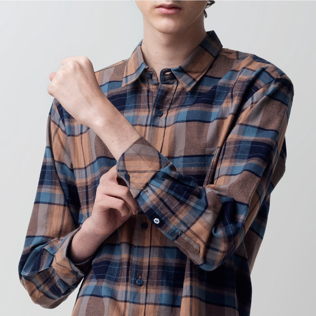 Kemeja pria lengan panjang dengan motif kotak dari bahan Flanel.